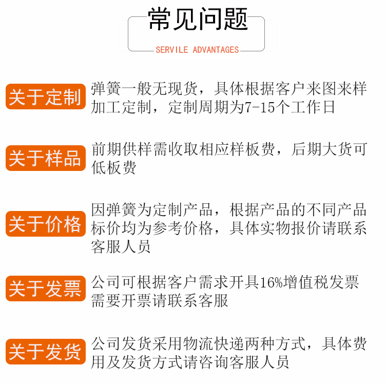 1、普通弹簧不收打样费(小线径,标准规格材质) 2、特殊材质 3、高难度、复杂型弹簧收取相应板费