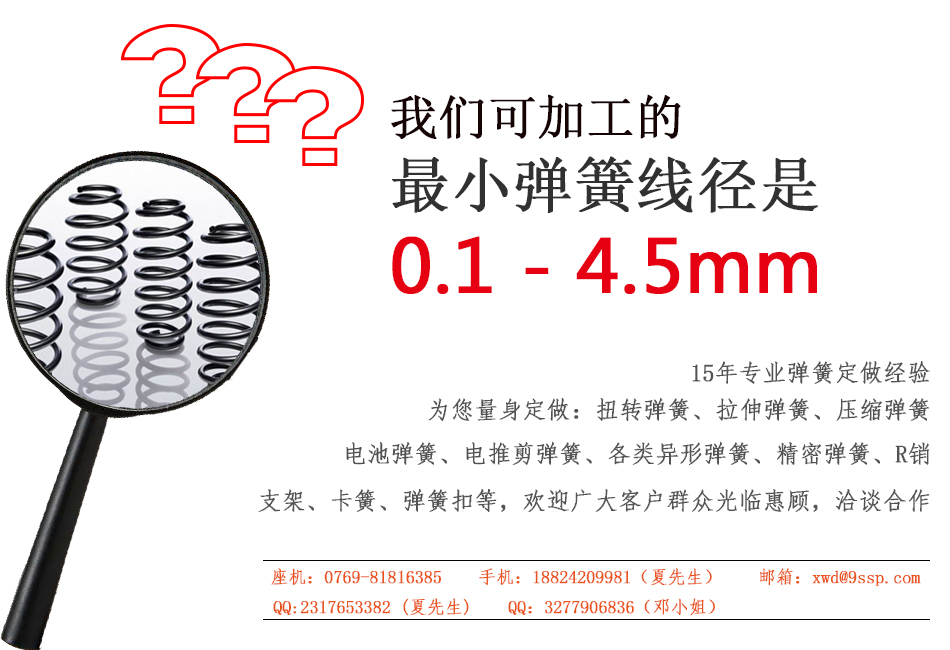 在线咨询东莞玖胜电池弹簧生产厂家专业各类弹簧生产,玩具电池弹簧,遥控器电池弹簧,各种电子电器电池簧,异形电池弹簧定制,不同规格,不同材质,随心订.我司弹簧线径范围在0.1-4.5之间