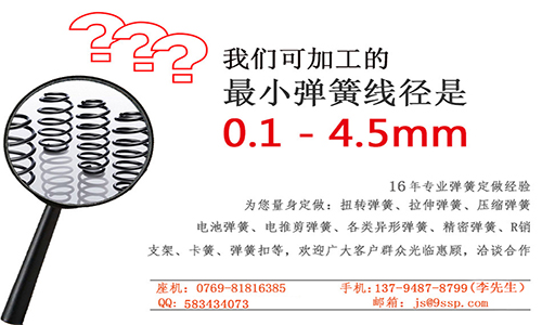 玖胜拉伸弹簧生产厂家以打造中国一流的耐疲劳弹簧为目标,专注耐疲劳弹簧17年,产品广泛应用于电器、开关、玩具、电子开关、汽车配件等行业。玖胜拉伸弹簧生产厂家已经通过IS9001质量体系认证, 弹簧检测设备仪器齐全,如:投影仪、扭力测试机、压拉力测试机、盐雾测试机,寿命测试机等 ,以诚信、实力和产品的质量获得业界的认可