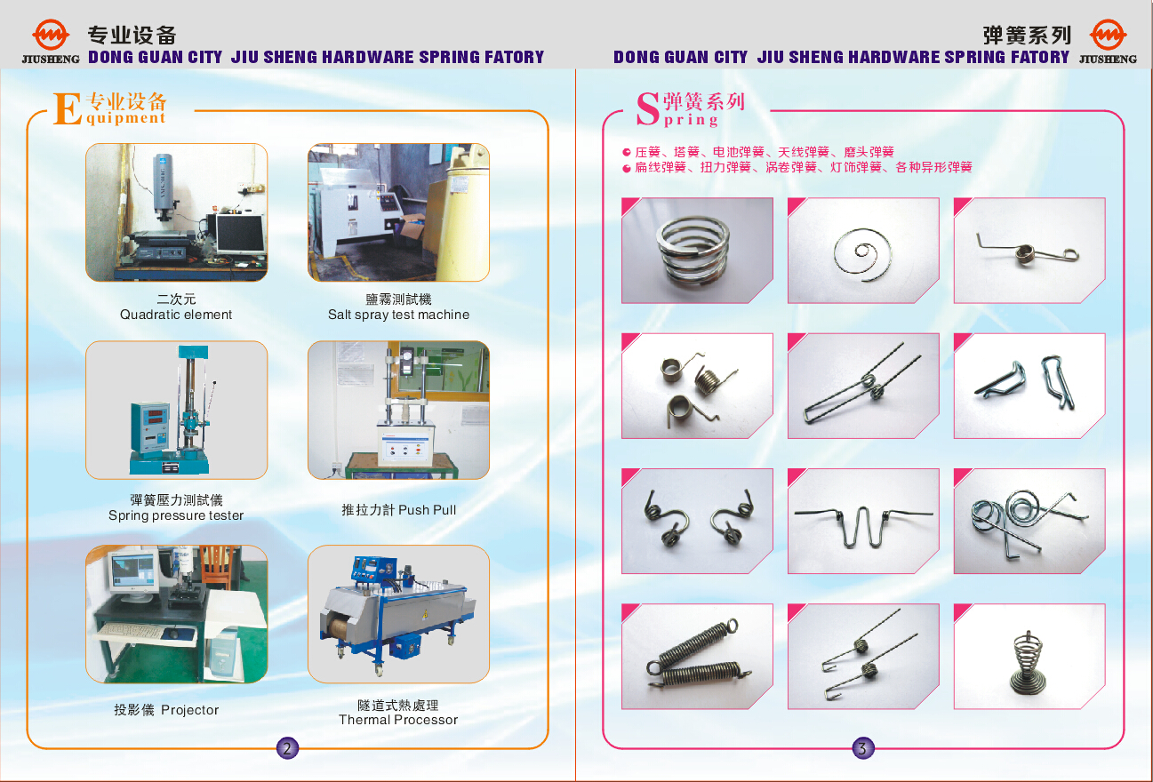 东莞市玖胜五金弹簧有限公司是一家专门做耐疲劳弹簧的厂家,公司已经成立了15年的时间,打造了一支技术一流的团队,设备生产齐全,拥有一整套完善的工作系统,从打样-生产-质量检测-包装-出货-售后服务都有专人管理。玖胜弹簧以打造中国一流的耐疲劳弹簧为目标,专注耐疲劳弹簧15年,产品广泛应用于电器、开关、玩具、电子开关、汽车配件等行业。我厂已经通过IS9001质量体系认证,主要生产:电池弹簧、压缩弹簧、拉簧、扭簧、异形弹簧、涡卷弹簧、触摸弹簧、电推剪弹簧、卡簧、扁线弹簧、碟形簧等。 弹簧检测设备仪器齐全,如:投影仪、扭力测试机、压拉力测试机、盐雾测试机,寿命测试机等 ,以诚信、实力和产品的质量获得业界的认可。