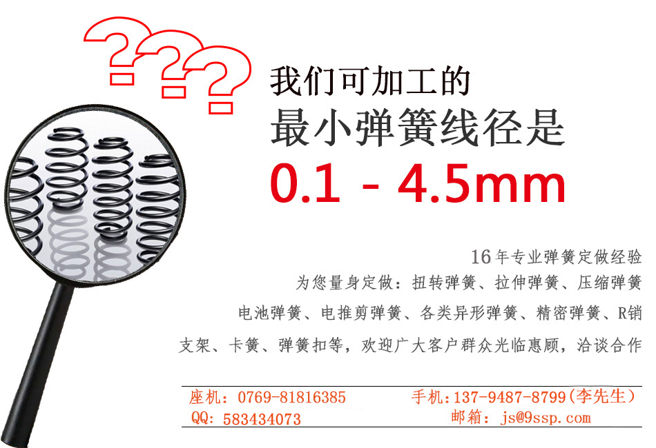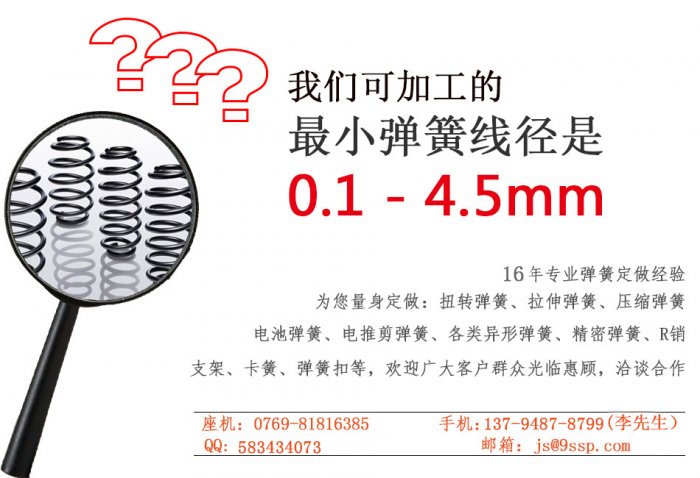 东莞市玖胜压缩弹簧厂家专业各类弹簧生产批发,触摸弹簧,压力弹簧,扭力弹簧,电池弹簧,拉簧,各种异形弹簧,精密弹簧等,我司弹簧生产线径范围:0.1-4.5mm,材质表面处理等按客要求。